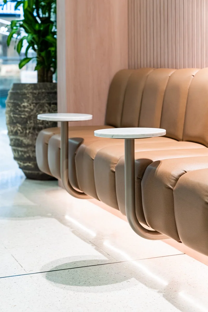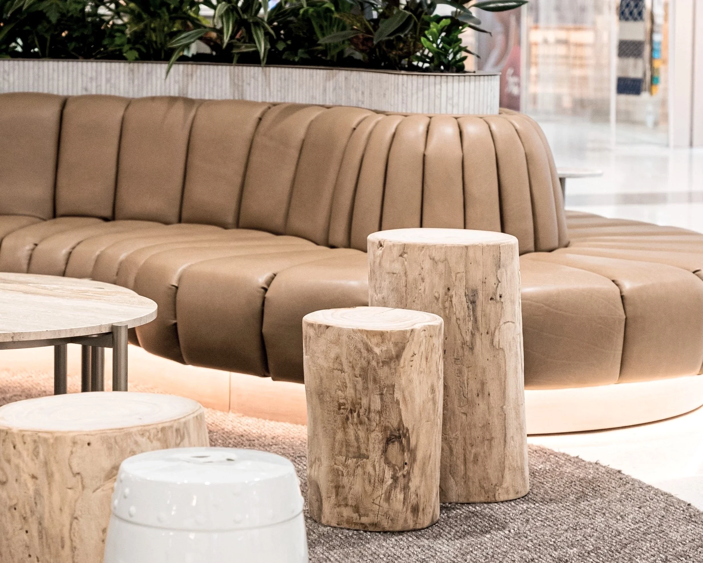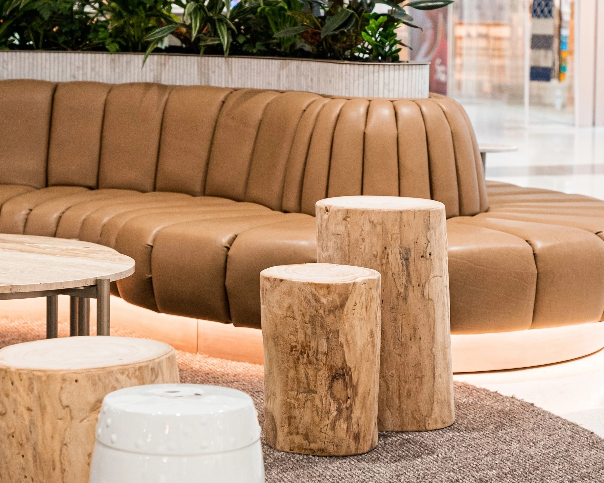 As part of the St Ives Shopping Centre upgrade, McBean & Co Design focused on revitalising the furniture to enhance the customer experience while staying within budget. Embracing a garden centre theme, we selected lush green leather banquettes and bespoke fabrics designed by Kerrie Brown to echo the surrounding landscape. The renewed carpet, with its dappled green pattern, evokes the gentle shade of tree canopies—offering a sense of calm and familiarity for both long-time residents and new families.