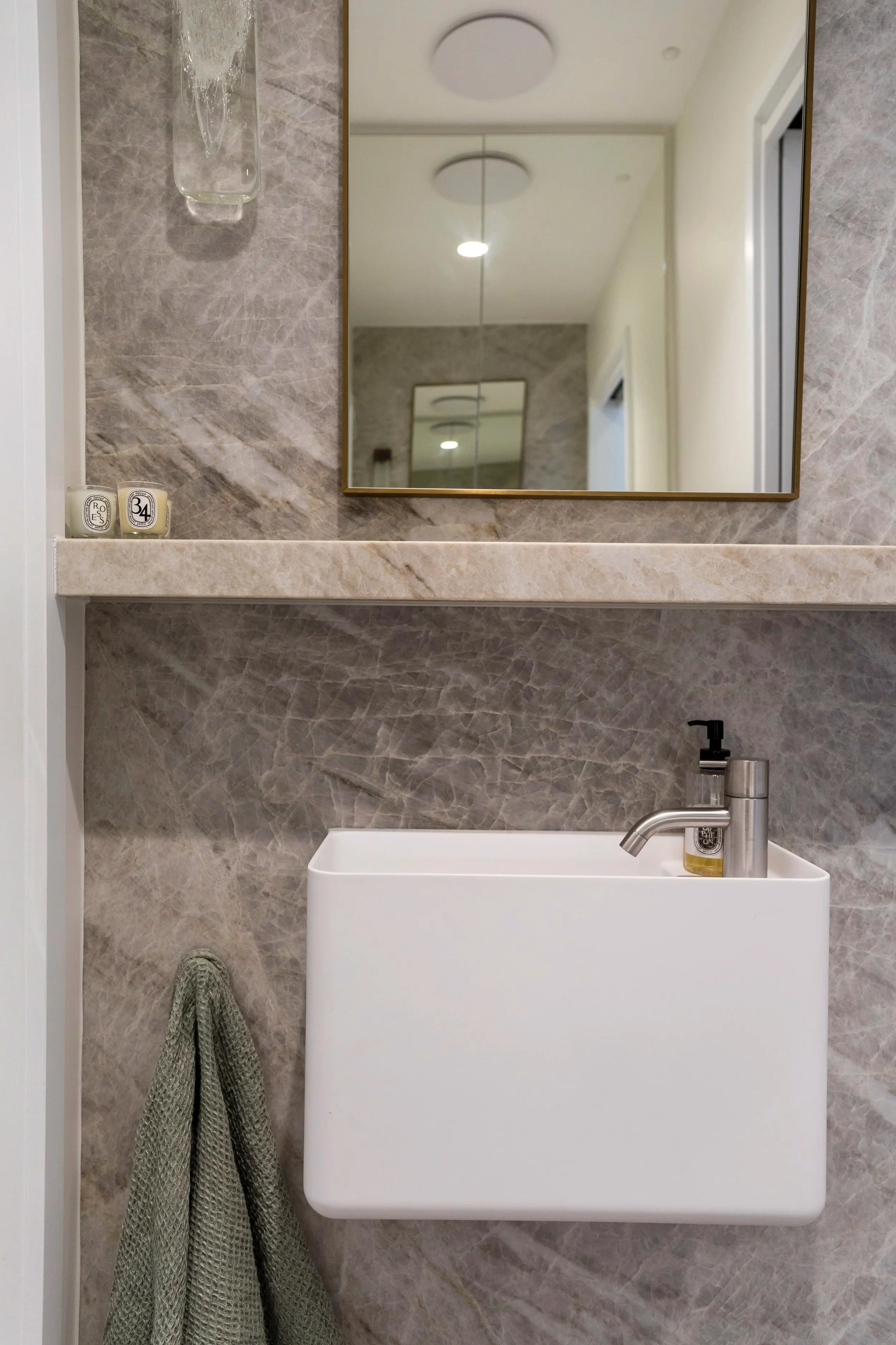All appliances have been fully integrated and concealed, creating a calm, clutter-free environment that flows seamlessly into the surrounding living spaces. To ensure visual harmony throughout the home, the adjacent powder room and laundry were also upgraded using the same material palette, enhancing the sense of cohesion and understated sophistication.